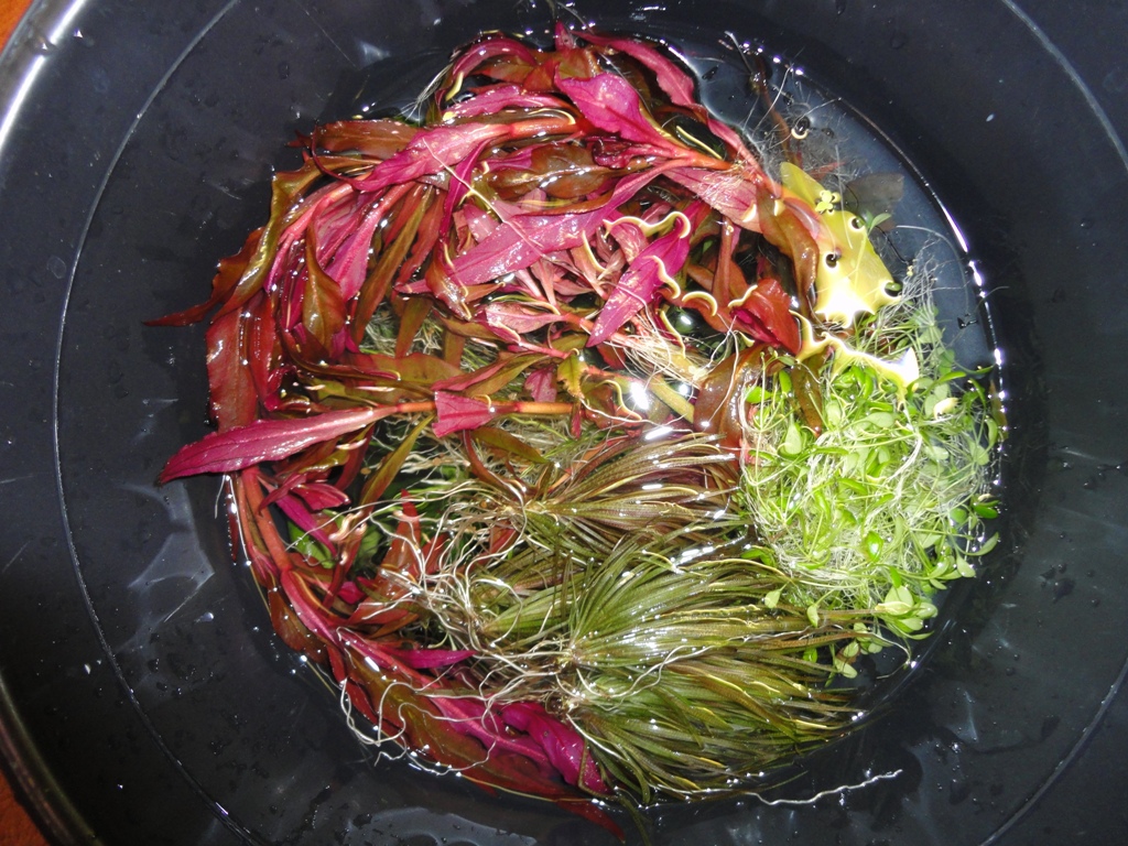 1. Трава всякая-разная (почвопокровка, анубиас, бликса, какой-то рубин красный, папоротник и т.д.) - 1,5 ведра где-то. 70 грн за всё.