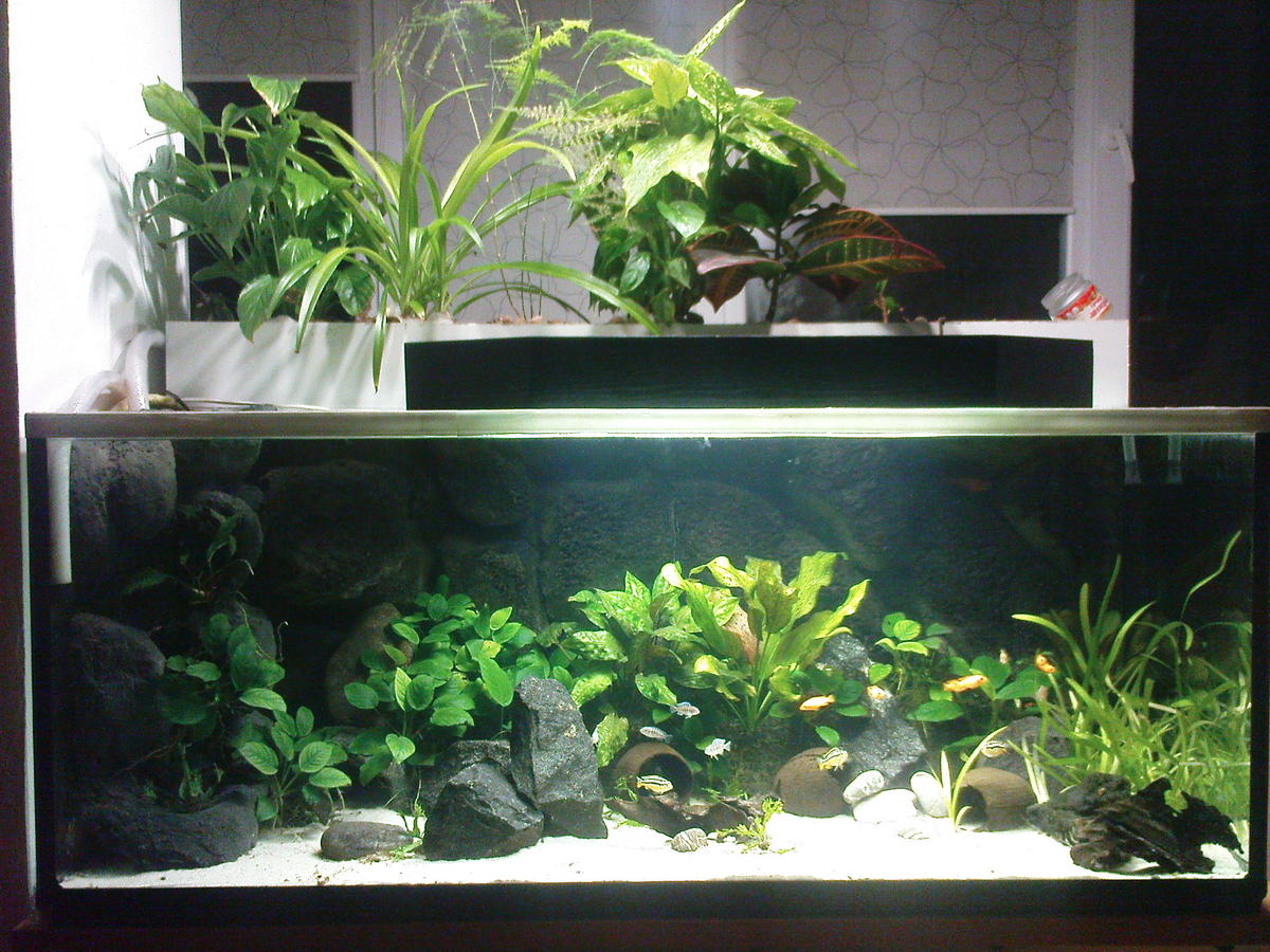 Здорово выглядит  Да еще и своими руками  Система подмены воды порадовала, мои тазики нервно курят в сторонке  А фон вообще загляденье! Хочу такой же  Очень интересно у вас все обустроено, сохранила в закладки на будущее