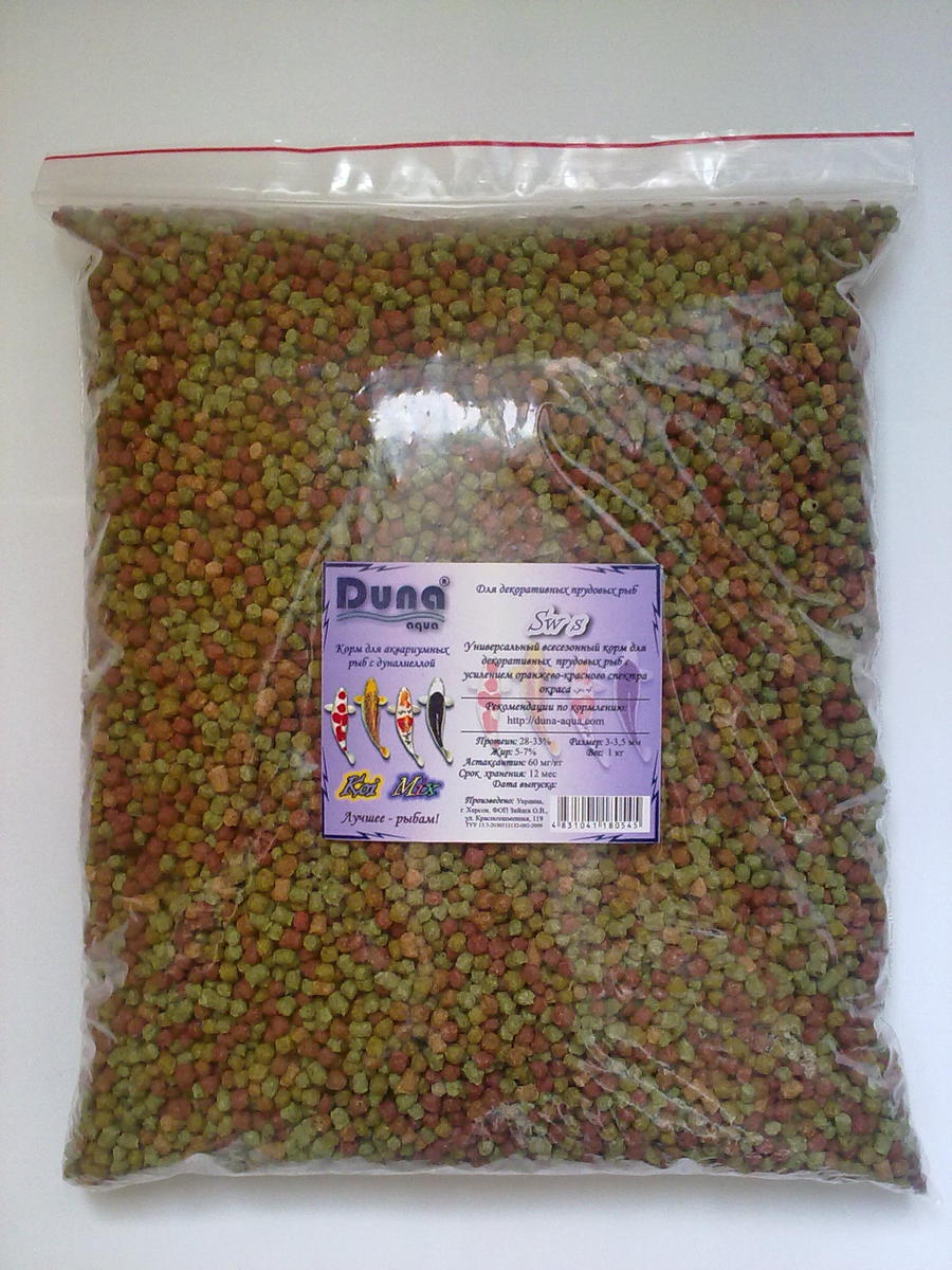 Для кормления прудовых рыб производителем предлагается новый вид упаковки данного корма весом 1 кг. Также данный корм можно приобрести в фирменном 25 л мешке (50*30*30) весом 7,5 кг.
