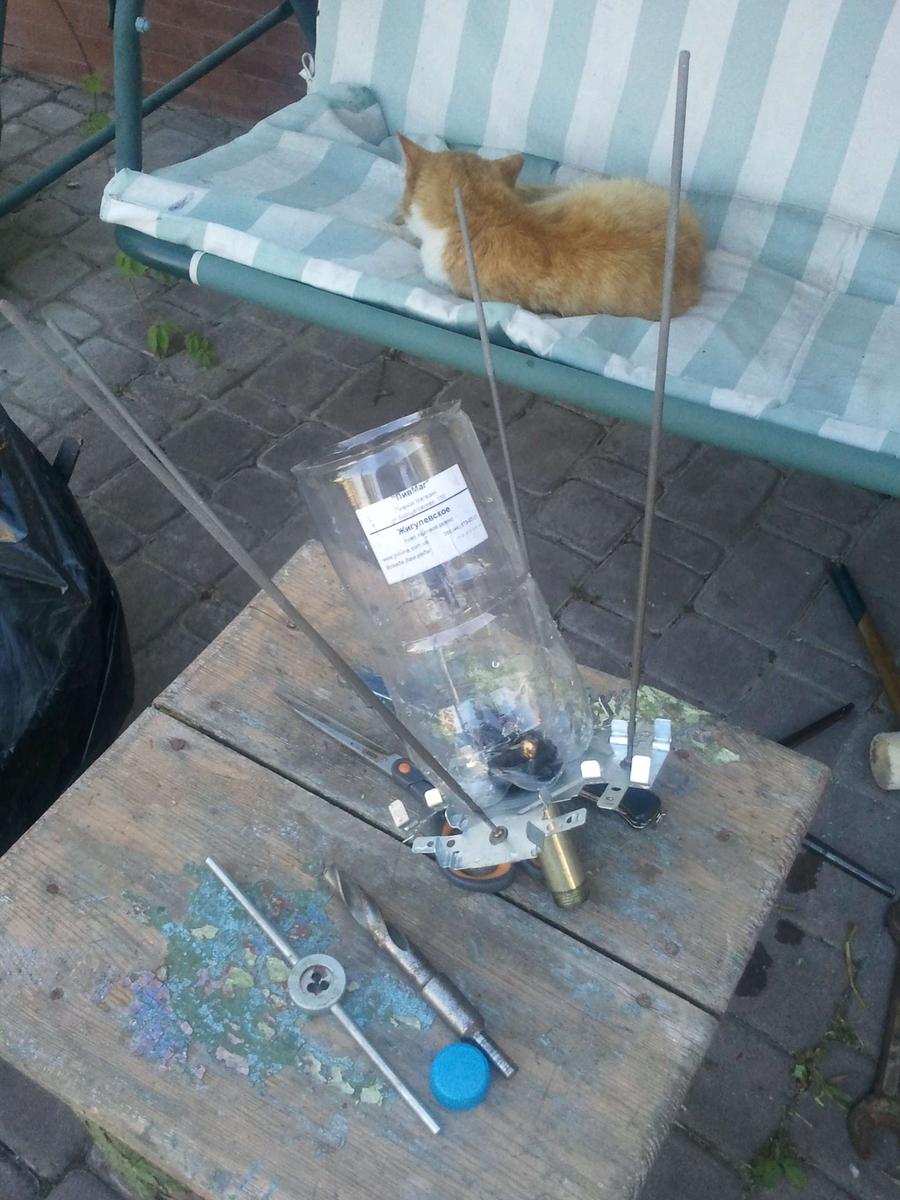 Контейнер (№1) из стаканчика 0.5л, ручка - дюбель для пенопласта. Сверху надо бы насадить поплавок - стакан уже раз утонул, еле достал. Пока ниткой привязал)