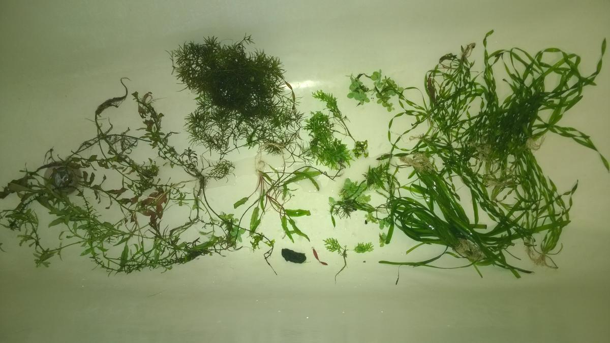 около 5 веточек гигрофилы многосемянной, людвигия ползучая около 8 веточек, криптокарина зеленая около 10 деток, криптокарина красная 1 кустик, папоротник индийский рассеченный около 5 маленьких кустиков, валиснерия обычная 5 кустиков, валиснерия спиральная 15+, 1 веточка элодеи, очень много наяса, пистия и возможно еще что то попало случайно.