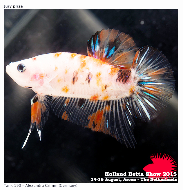 Holland Betta Show 2015.M2 Asymmetrical Halfmoon plakat male – Marble (27 fish by 11 breeders from 5 different European countries)