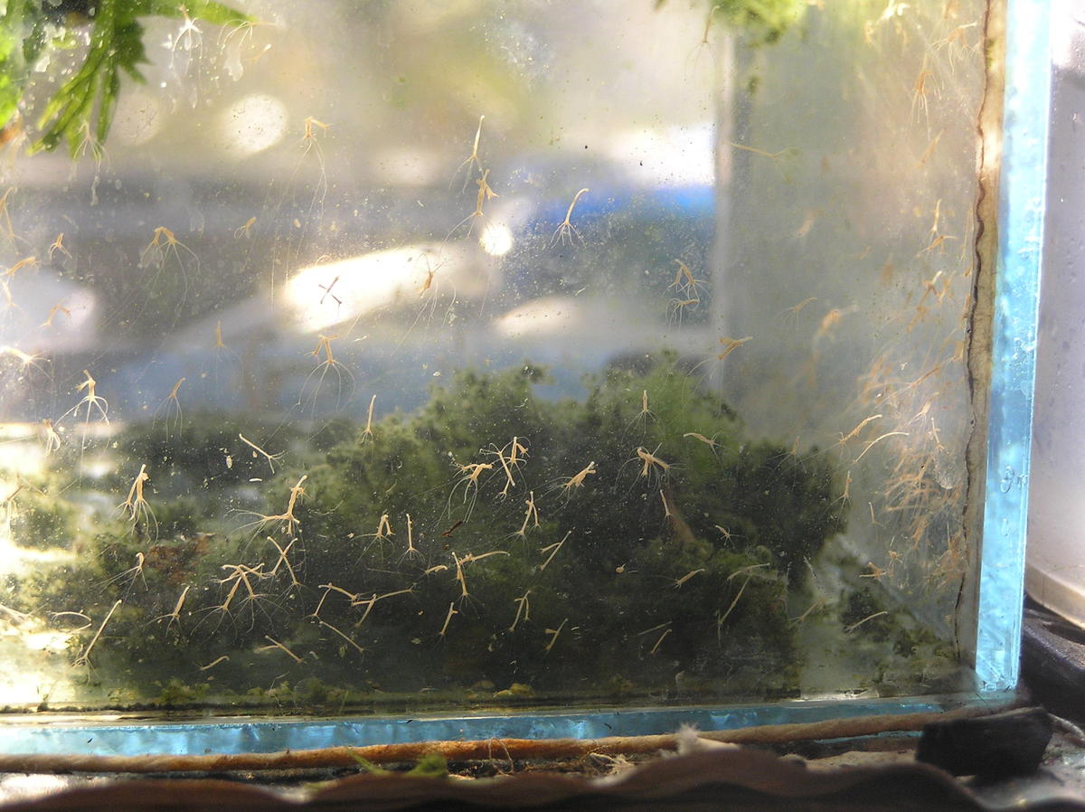 меня как-то не оставлял вопрос,правильно ли автор сообщения идентифицировал паразита,т.е. гидру.В одном из своих малявочников специально дал развиться гидре за неделю.Ела только циклопчика.Вот фото её наибольшего расцвета.