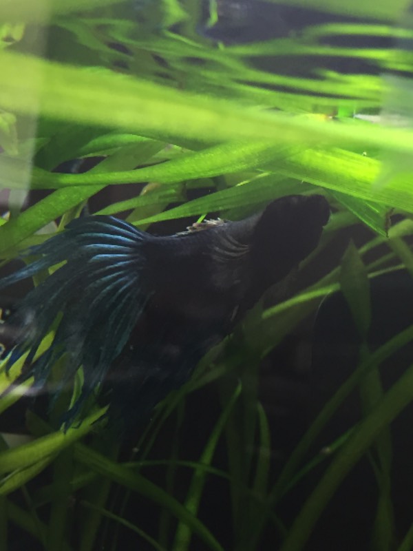 В пятницу была очередная подмена воды(раз в неделю) , промывка мха и чистка фильтра, все по схеме как обычно. В субботу петя не вышел на кормление. Поискала его, он в камнях прятался, редко всплывал. В воскресенье, выплыл на кормление, активный. Был замечен с ободранным или сгнившим верхнем плавником. В понедельник из камней нельзя было выгнать. Не замечала чтобы всплывал. Сегодня опять выплыл активный на кормление и всем интересовался. Сидит на своем месте над фильтром, пока не прячется.