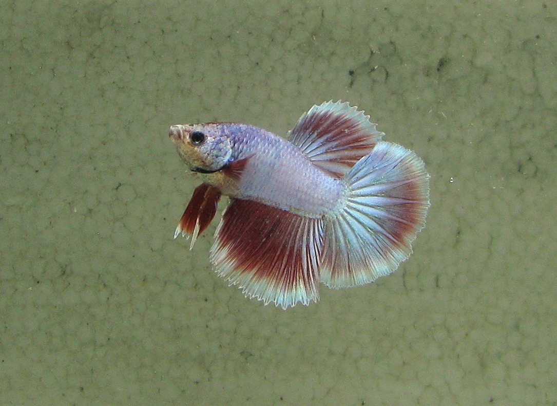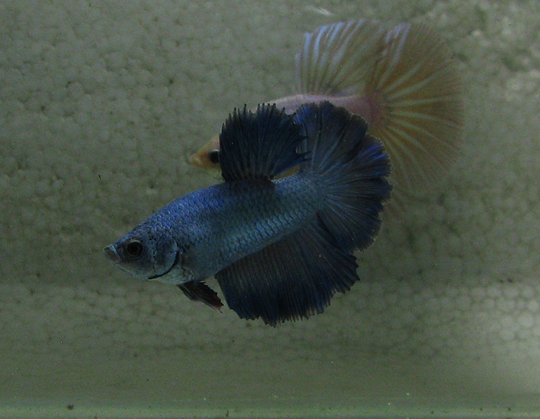 А с этим не пойму что происходит. У него не то рвутся, не то продолжают расти но уже лучами плавники.. Ну и поведение, особенно в сравнении с новеньким, оставляет желать лучшего. В толще воды он плавать никогда не мог, он с трудомпогружается, потом с усилием всплывает. Самкой интересуется изредка, на зеркало не реагирует. Но активно реагирует на людей и еду ).