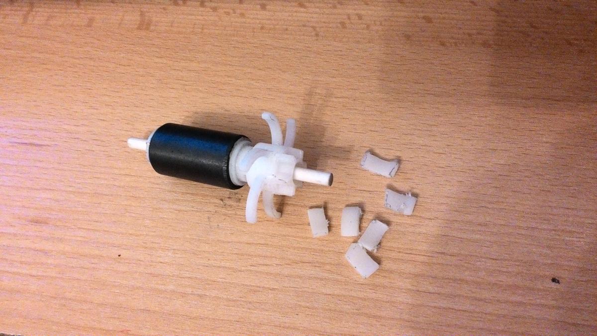 Поставил ротор и ось керамическую от фильтра ТЕТРА, стал работать тише, но как пенит не понравилось, поэтому переделал ротор. Срезал лопасти по высоте, оставил только тонкие спицы примерно 1-2 мм, на них наложил энкамат в 2 слоя и пришил его к остаткам лопостей леской, потом по месту подгонял ножницами.