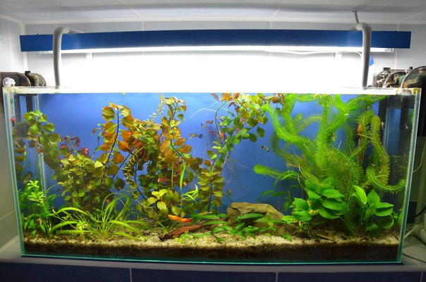 Продам акваріум-картина 90х40х19 см. Він стоїть в ніші в ванній кімнаті. Акваріум зі скла 6 мм, має два ребра і дві стяжки, наклеєний фон голубого кольору. Два навісних зовнішніх фільтри (ціна за нові 130 і 230 грн.), всі рослини, креветки (більше 100 шт.), грунт білий кварц, камінь як декор і коряжка. Цей весь набір віддам всього за 420 грн.