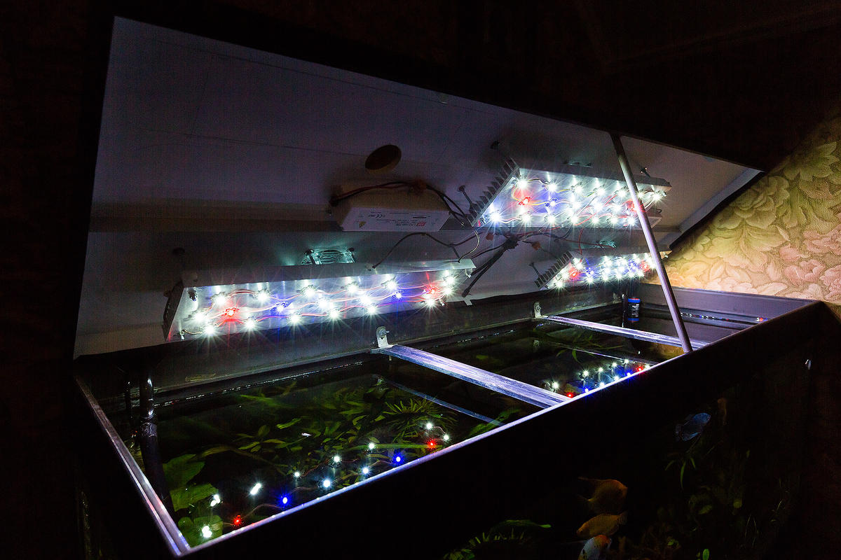Крышку делал я сам полностью. ПВХ 6мм + алюминиевый уголок. Стоят три кулера на каждый светильник. Предусмотрены два открывающихся люка для кормления.