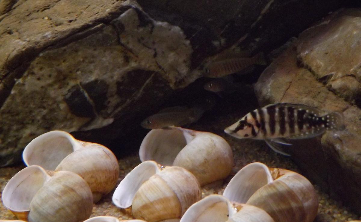 В сачке выпустил над раковинами. Все равно двое умудрились рвануть в сторону. Сидят недалеко, за камнями. Остальные уже поели моину вместе с кальвусами и обсматривают раковины.