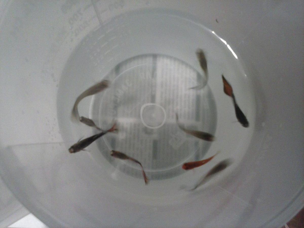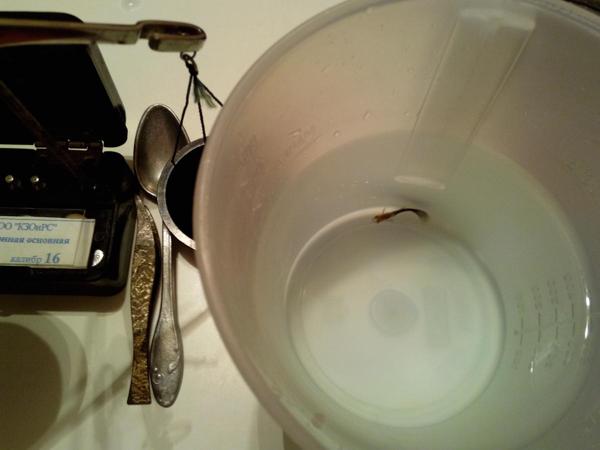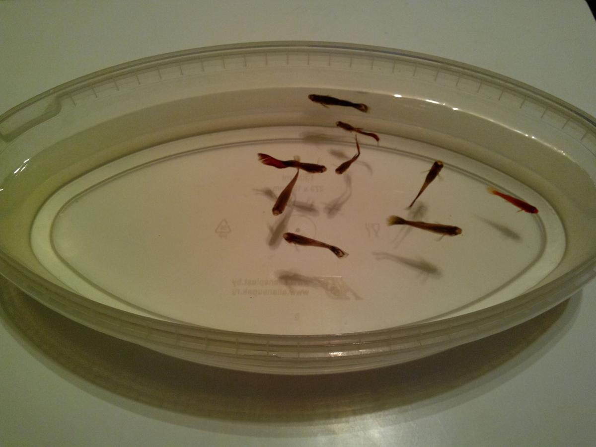Обрабатывались одновременно 9 рыб. Все они были куплены в один день у одного продавца. Обработка проводилась в день приобретения. Как видно на фото, одна из рыб обработку не перенесла. Дело в том, что эта рыба изначально вела себя подозрительно, не так как остальные. Скорее всего, она была чем-то ослаблена (паразиты, вирусы, или еще что-то). Причем прошу заметить, что во время нахождения в рабочем растворе, эта рыба никаких признаков дискомфорта не проявляла, ну разве что под конец стала чуть менее активна остальных, а заваливаться начала через 20 минут при ополаскивании. Остальные рыбы перенесли обработку вполне хорошо и после ополаскивания были отправлены в отдельную емкость для наблюдения. Во время нахождения в рабочем растворе, примерно на 10-15-й минутах, три рыбы слегка выпрыгивали из воды, прилипали к стенкам сосуда и отваливались обратно. Не знаю как это расценивать. Если бы рыба пыталась выпрыгнуть массово, я бы остановил испытания.