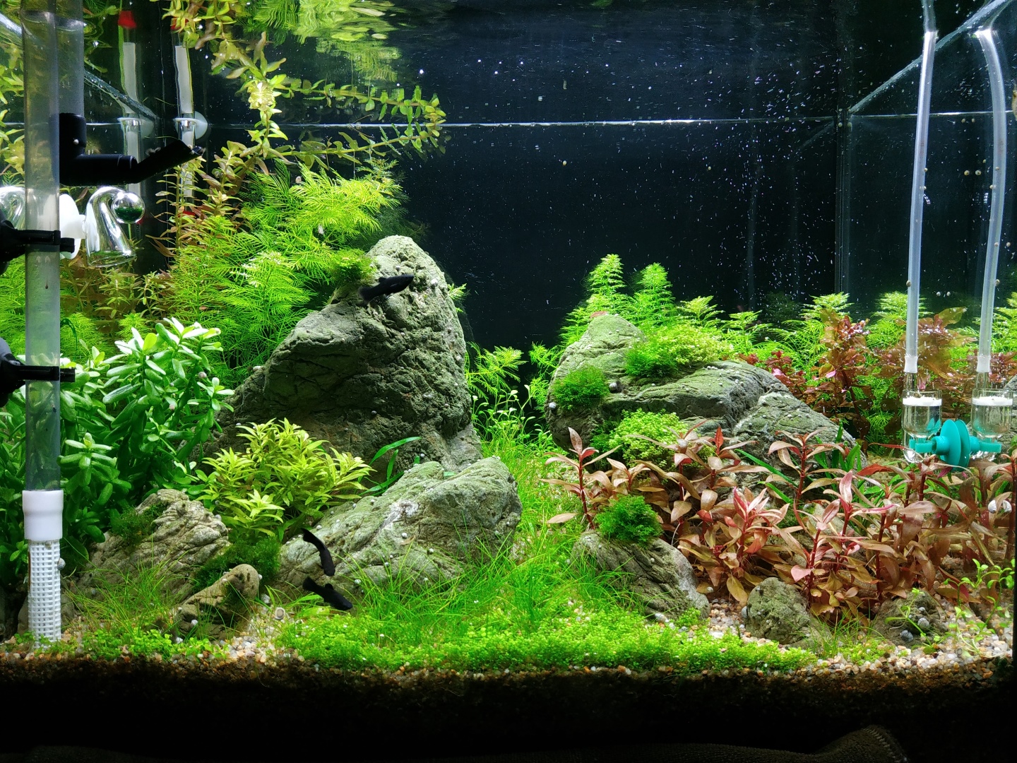 3. Фильтр сильный для вашей аквы. Поставьте поменьше. По сути фильтр нужен на старте , собирать мусор. А дальше уже достаточно чего то что перемешивает воду. Но не сильно, из за мощности фильтра у вас выветривается СО2. Поэтому ПШ - 7,5. И лучше , когда смените фильтр, и не захотите переходить на рябину, переместите колокол, над фильтром, чтобы несильное течение захватывало СО2.