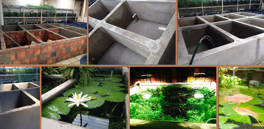 Здесь фото одной из разводен извесного бридера меченосцев из Бразилии , г.Масейо , Elzio Ornamentais Albuquerque . Показано строительство и внешний вид больших емкостей . Они используются для выращивания(выгонки) малька , получаемого в этой же разводне в аквариумах . Просто если вместо емкостей из кирпича , делать аквариумы такой же емкости , но из стекла или оргстекла , то это в десятки раз будет дороже , а в теплом климате такие затраты излишни и сильно увеличивают себестоимость рыбы . Поскольку плотность посадки меченосцев близка к норме(примерно 20 литров на рыбу) , отпадает надобность в фильтрации и аэрации - а это еще больше удешевляет разведение . . .
