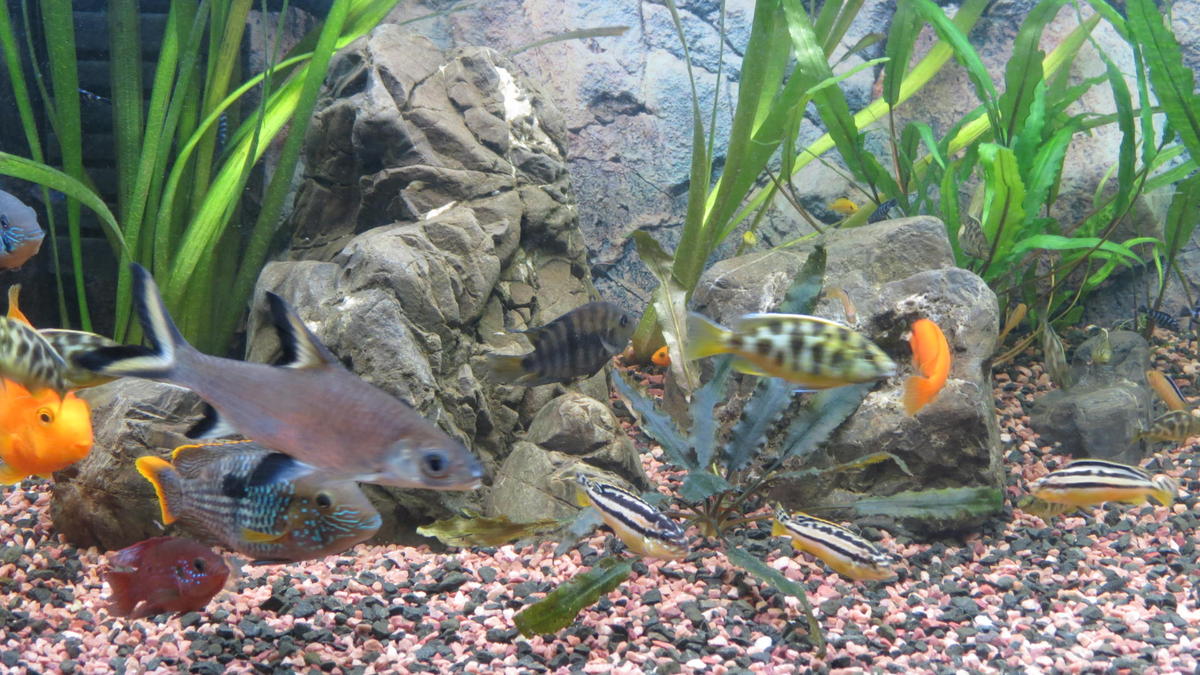 Вот приехал и свет сегодня. Также до этого появились в аквариуме и камни. Очень повезло, т.к именно такие хотелось. Камни смотрятся просто потрясающе. Сегодня подарили мне трех хромисов-красавцев (самца и две самки). Уже взрослые вроде бы.