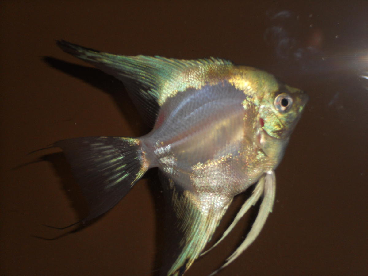 На зарубежных ресурсах широко употребляемое название-GREEN SMOKEY,SMOKEY.У нас чаще используется "зеленый ангел". Смоуки (Smokey) Sm/+. Ген смоуки ответственен за возникновение серо-коричневого узора на задней половине тела скалярии. Мальки имеют нормальный рисунок, однако, когда достигают размера горошины, утрачивают его. Значительная часть задней половины тела серо-коричневая, но обычно не вся. Шоколадный Sm/ Sm. Гомозитотные по гену смоуки особи именуются шоколадными, потому что их тело почти полностью серо-коричневое. Среди основной фоновой окраски проступают серебристые островки. Леопардовые (Sm/Sm — Z/Z) или (Sm/Sm — Z/+). Леопардовая вариация имеет пятна на большей части тела. (Smokey x Zebra).