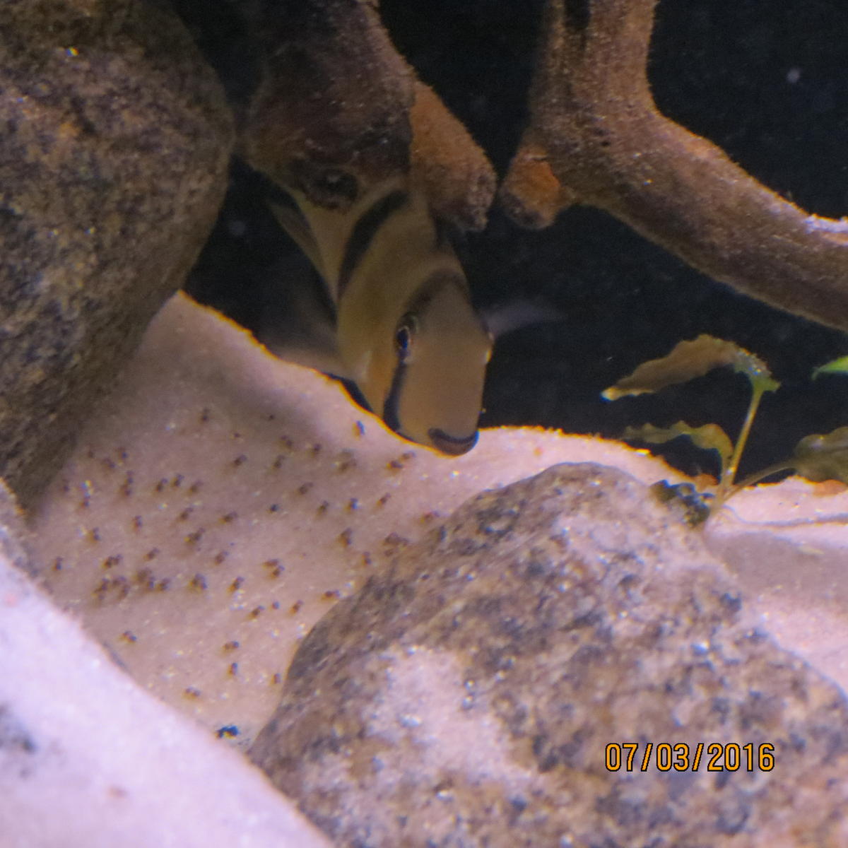 Вот такой сюрприз к 8 марта. Все соседи выселены, оставила только родителей.Кормлю растертым Очень мелко сухарём (Танганьика от ЖБЛ) и желтком, во время кормёжки малёк очень активный.Самка время от времени отгоняет от кладки самца. Сегодня куплю планктон, попробую кормить им.