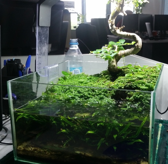 Сделал себе на рабочем месте зеленый уголок. Но решил не просто ограничиться несколькими вазонами с растениями, а совместить свое любимое увлечение аквариумами с давней мечтой - деревом Бонсай...