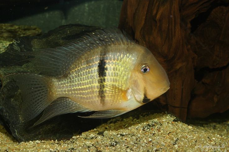 Начну краткий обзор по видам: Guianacara geayi (Pellegrin, 1902) – Гайанакара Гейи. (Англ-Bandit Cichlid) Синоним: Acara geayi. Венесуела, Бразилия, бассейны рек Аппруак, Ояпоки. 8-10 см, самка меньше. Через глаз проходит черная полоса. Посередине черное удлиненно вертикально пятно. Первые лучи спинного плавника черные. Непарные плавники желтоватые. Рыбы относительно мирные, особенно в крупном аквариуме, держатся в среднем и нижнем слоях вода. В период нереста очень агресивно защищает свою территорию, в остальное время относительно спокойны. В оформлении аквариума используют сооружения из камней и коряги для создания пещер и скрывающих мест. Растения высадить в горшки и обложить камнями. Пары определяются самостоятельно из группы молодых рыб. Половая зрелость в 10-12 месяцев. Нерест может происходить и в общем аквариуме. рН 6-7,5; dH 8-15; 22-25°С