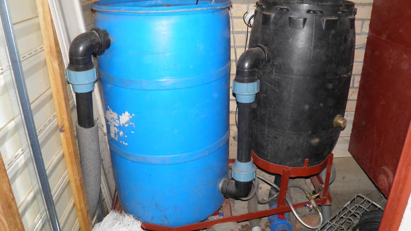 Куплен насос "акваэль 10000"с рег. мощности.Приготовлены 2 бочки на 100 и 220л. Сделал мех. фильтр "циклон" в надежде, что крупный мусор будет оставаться там, затем из него на бочку 200л для биозагрузки, а от туда по трубе д.63 к малому водопаду.