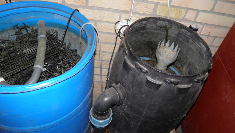 Вода насосом подавалась по трубе д40 на "циклон" а от туда - на биофильтр из бочки на 220л. От биофильтра трубой д63 под землёй шло на вход биоплато. Сначала отстойник с гиацинтами- а затем по щебню с растениями.