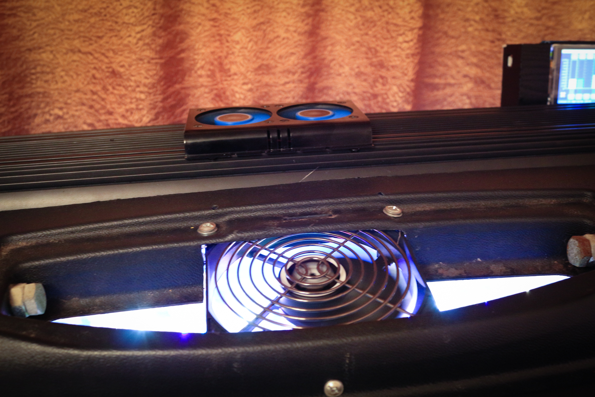 По ходу тестирования радиатора выяснил что без куллеров мне не обойтись. Если включить все леды (30 белых и 30 цветных) на полную мощность (0.7А) то температура в пасиве уходит за +50С. Поставил спаренный куллер сверху, оборотами управляет ардуина в зависимости от температуры. Еще один кулер размесил в окошке для кормления рыб, этот уже для обдува воды (частотой также динамически управляет ардуина).