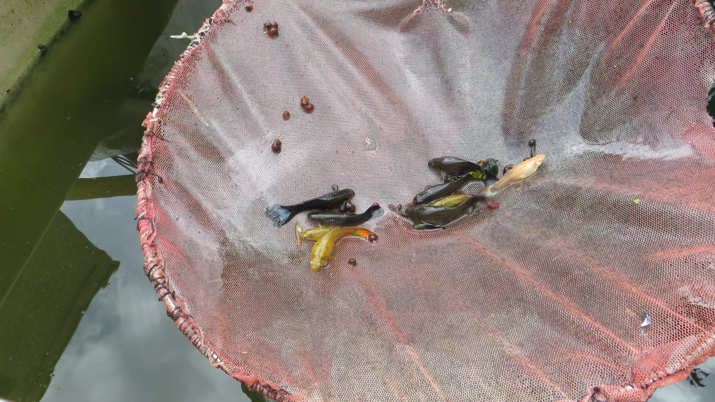 В связи с повышением температуры аппетит возрос и рыбы стали реагировать на корм. Бросаю небольшую щепотку, когда приезжаю на дачу. Что-то вроде природовских хлопьев, разноцветных. Да, кстати насчёт живого корма. После обработки сада-огорода от тли, они поселились на сорняках. По срывал, и промыл это всё дело в пруду. Рыбы набросились сходу, и даже не пугались, что я рядом сидел.