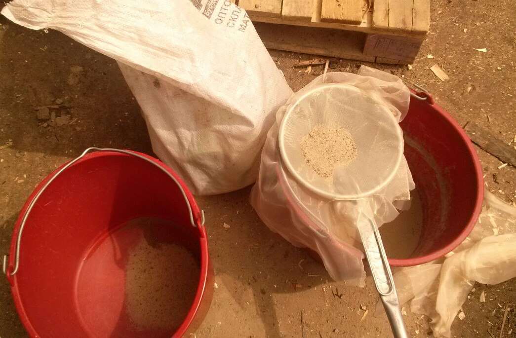 Вот ее (пыль) и надо отсеять, я набирал в сито на кромке воды и вымывал в реке пока не оставался крупный и так 2-3 часа и ведро отличного песка))