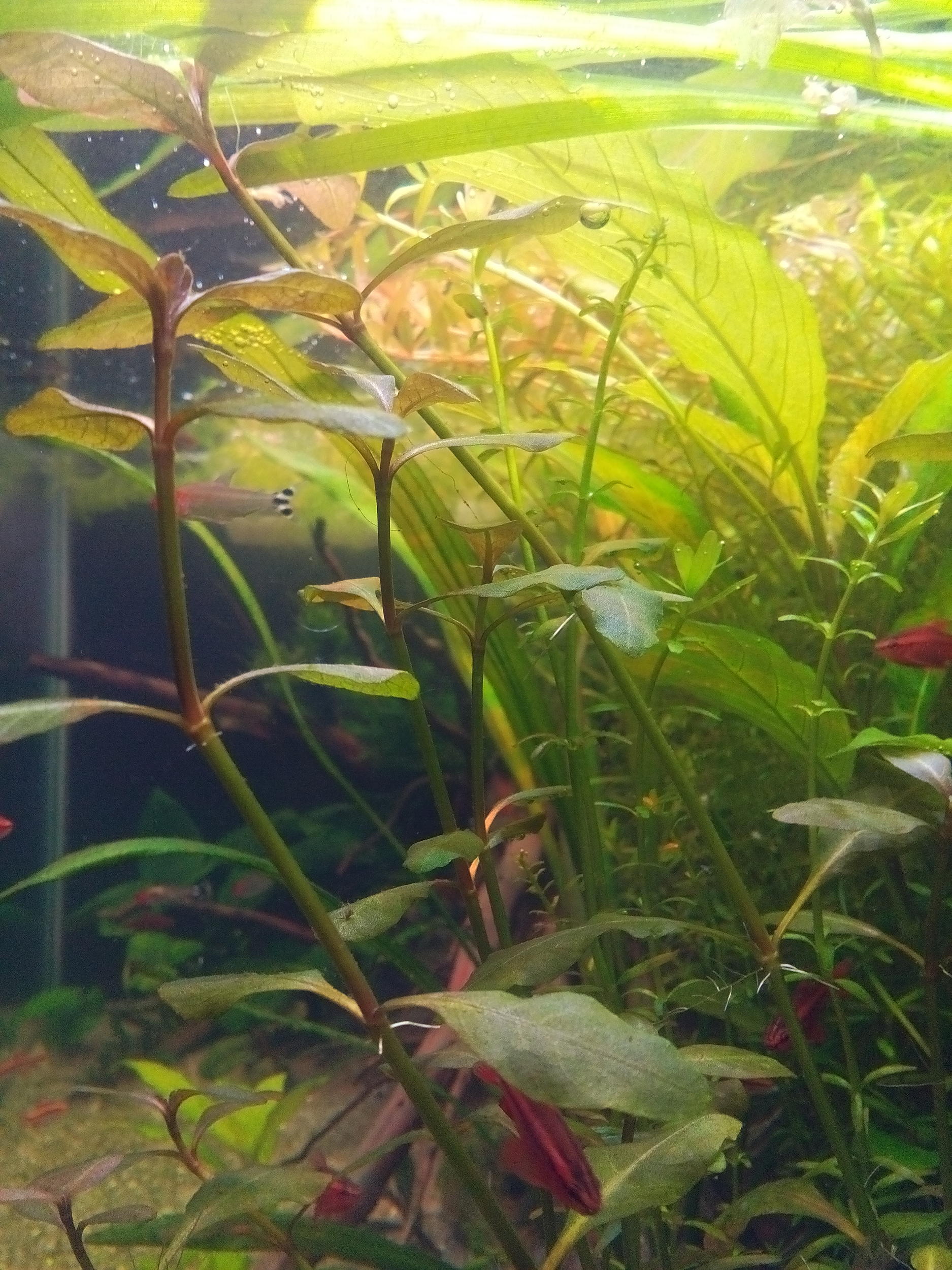 .... а вот нижние листочки красноречиво показывают голод азотный.... гигрофила листики бросает,т.к тяжко ей на азотной диете много лепестков тянуть.
