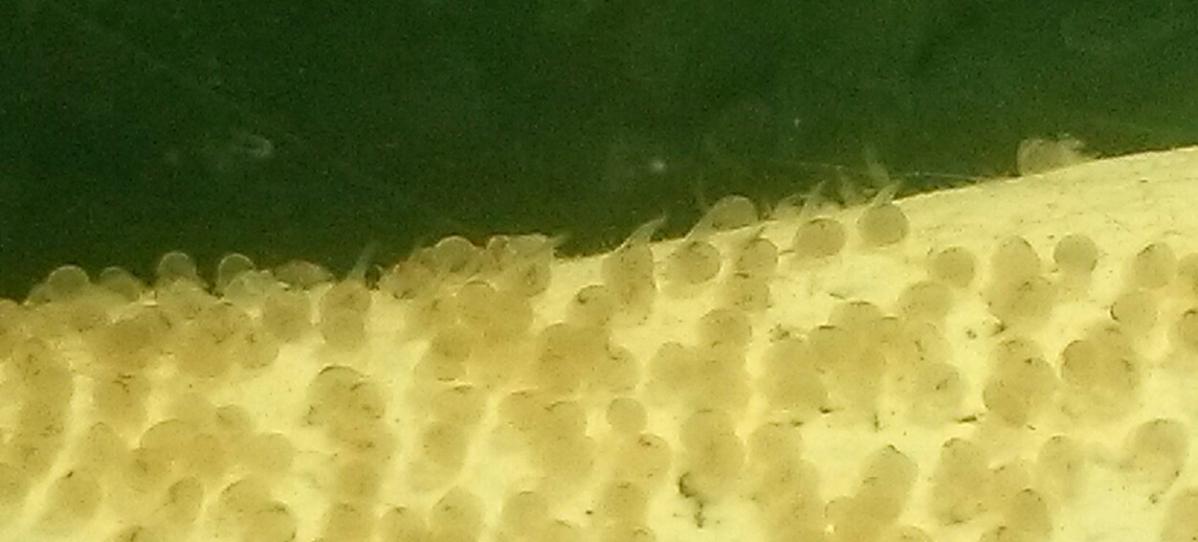 Через сутки, на вторые- в икринках зарождается жизнь ( фото). На третьи- появляются хвостики, а на четвёртые личинка начинает постепенно спрыгивать с конуса или листа.