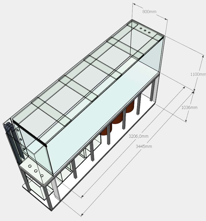 пока аквариум не утверждён. для уменьшения веса можно подвинуться на 15 см в высоту и на 10 в глубину ( 3440* 700*950(h)). Реально аквариум в длину 3200мм, остальное - шахта