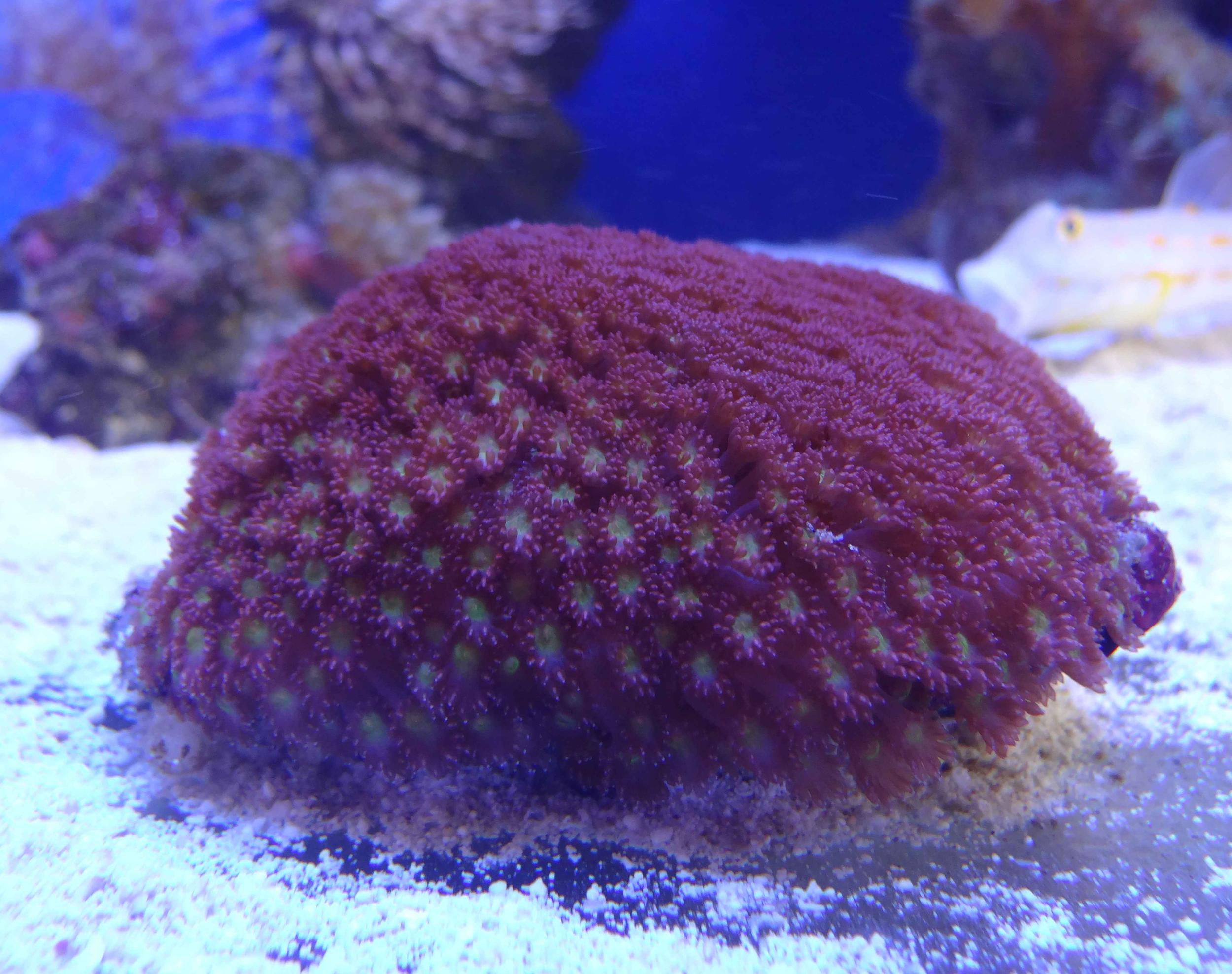 Фраг Goniopora minor(мелкополипная)бордовая с желтой серединкой 7х7см.- 1300грн.-продано