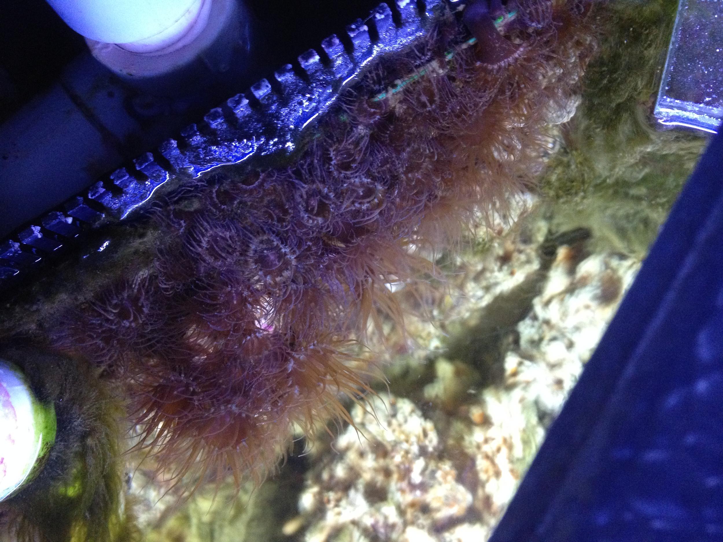 влад3ак, Посмотрел я ваши фото и мой вам совет, пока у вас бурно колосится нитчатка трудно вам будет вывести айптазию потому как мелкая роза прячется в нитчатке и её ни Хелман ни кто другой оттуда доставать не будет. Заготовьте воды осмотической треть вашей системы. Протестируйте систему на фосфат (желательно и на силикат ну и на нитраты ясное дело) и думаю вам надо купить антифос и уголь . Вам надо остановить систему на пару часов слить воды примерно с треть в ёмкости , удалить механическим путём всю айптазию с стенок и трубок а также и нитчатку в срочном порядке ( исключить попадание в риф то что ободрали). Потом в той воде что слили помыть щёткой доступные камни от нитчатки и айптазии и всё вернуть в риф . Долить приготовленную свежую солёную воду . Далее вам необходимо на ваш обьём поставить антифос. Через дней 10 протестировать если улучшилось и фосфатов не стало то убираете антифос и ставите уголь . Хорошие помощники в борьбе с нитчаткой это собачка сопярис, лисичка Ло. Они на 99% её уберут это точно. Работы у вас уйма, не хочу расстраивать но месяца два это 100% точно а то и более. Это что вам надо сделать сразу , далее не меньше работы. Звоните ,я подробно обьясню что как дальше делать.