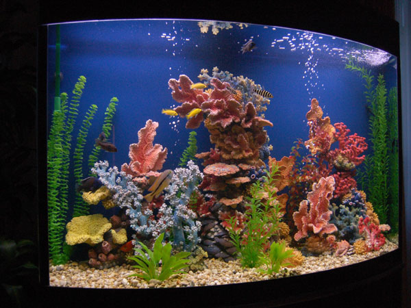 Добавил один корал,убрал цветные растения,так-же заменил фон на голубой и поставил синюю подсветку.