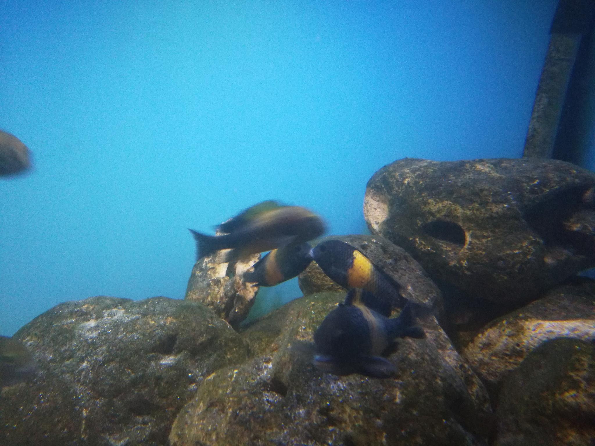 - Lamprologus Caudopunctatus они разбились 3 на 3. 3 штуки бороздят просторы аквариума вместе с торфеусами. А остальные 3 нарыли себе ходов под одним камнем в углу аквариума. И пытаются держать оборону. Но толстые и наглые трофы умудряются залезть в их нору.