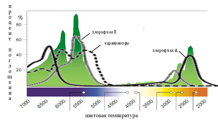 2500К поглощается растением на 30% а вот 5500 практически на 100%