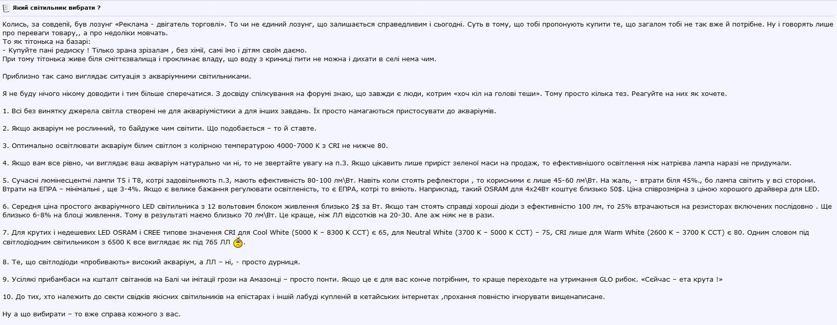 Свою точку зору щодо акваріумного освітлення я рік тому написав