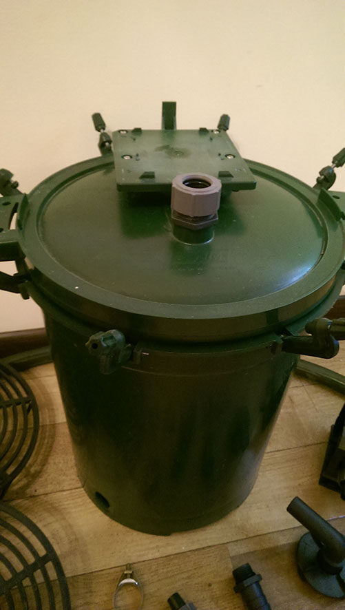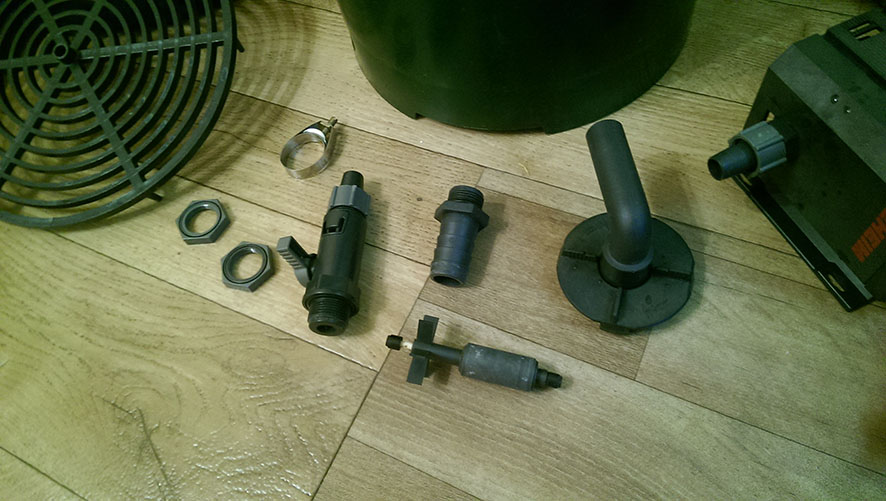 Комплектация фильтра на фото - сам фильтр со штатным краном, губка толщиной 5 см и пару метров шланга 25/34 мм.
