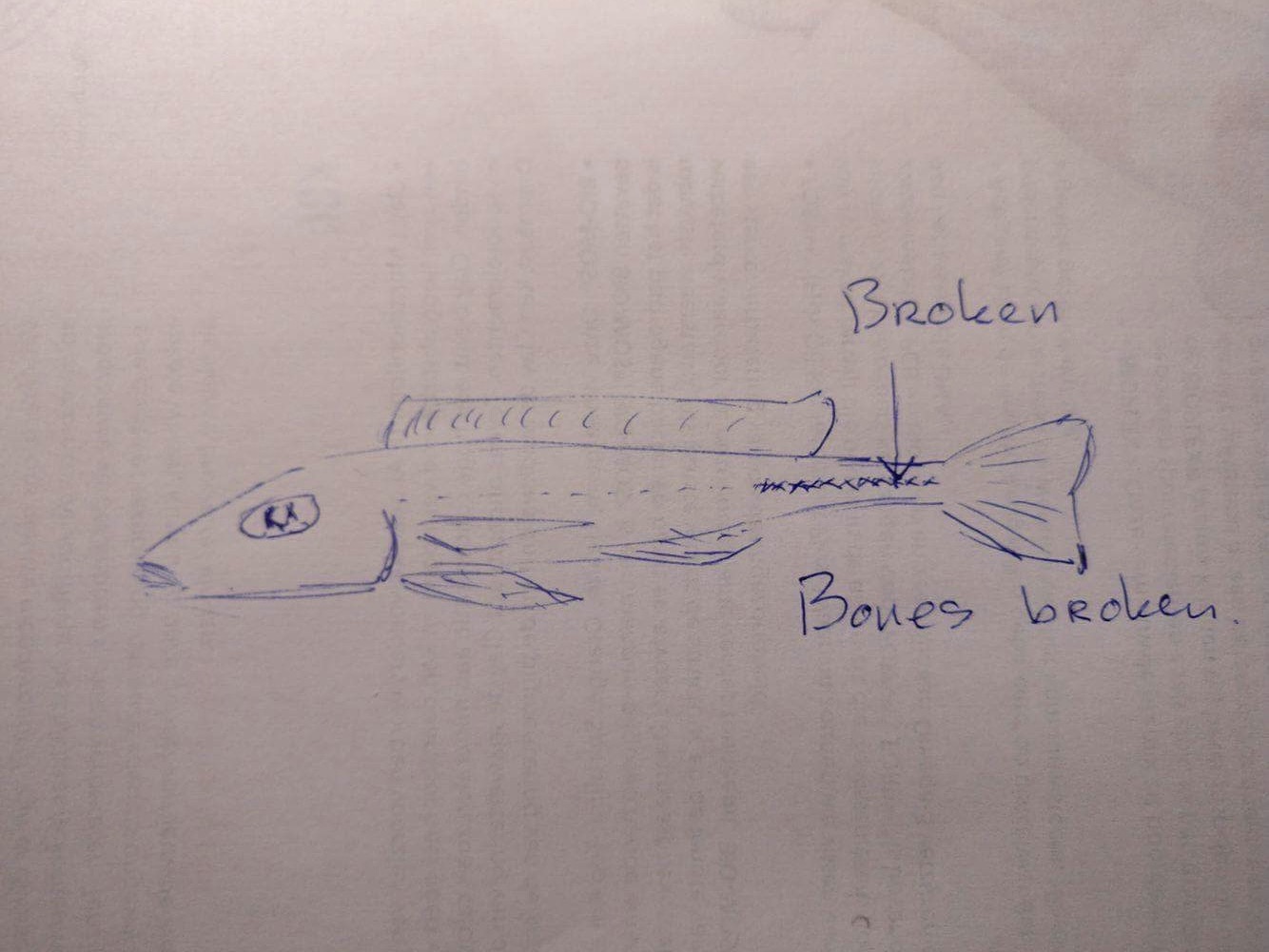 Друзья, хочу поделиться с Вами одной очень важной информацией , которой со мной поделился уважаемый Rene Kruter . Дело в том , что многие любители дикой рыбы часто сталкиваются с такой проблемой , как сломанный хвост у рыбы . В основном эта проблема затрагивает дикую рыбу , так как когда ее ловят, ловцы часто ломают рыбе хвостовую часть , в первые две недели внешне это практически не заметно , но через пару недель , в хвостовой части рыбки появляется красная полоса,это означает что у Вашей рыбы сломан хвост! Такая рыба к сожалению обречена на гибель, и лечить её бесполезно , можно сказать это равносильно сломанным позвоночникам. Будьте внимательны при покупке рыбы, старайтесь тщательно ее осмотреть . Уважаемый Rene , нарисовал для нас схему , на которой показано в каком месте часто ломается хвост . Такая проблема часто бывает у Enantiopus, Leptura , и других Xenotilapia. Надеюсь данная информация поможет избежать Вас от приобретения больной рыбы !
