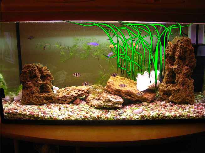 Акваріум ще не закінчений. Буде доставлятись ше пару камнів, і докуплятися ше 4 цихліди.