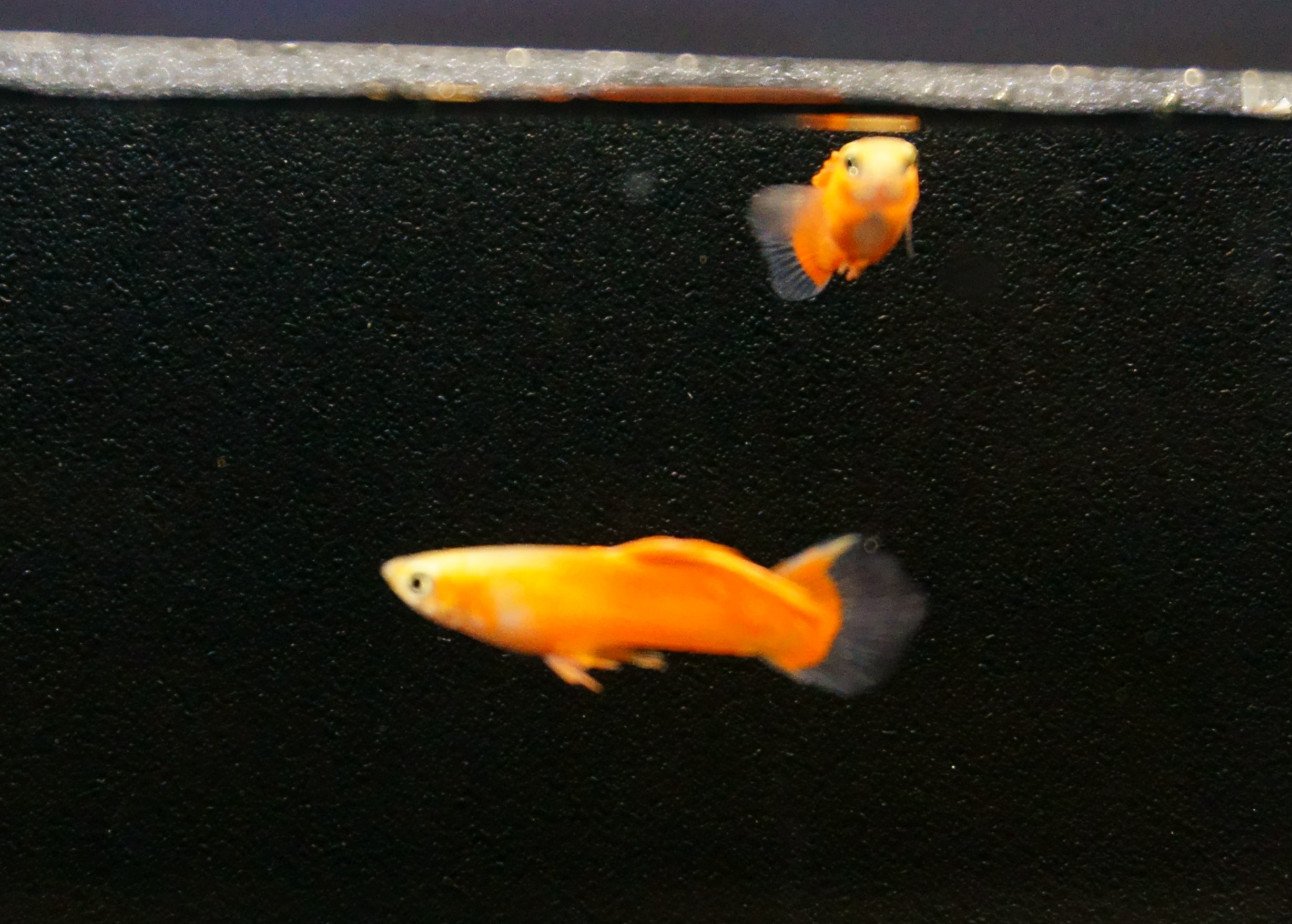 Размер рыбок вместе с прозрачным хвостом 20-25 мм . Смотрятся в аквариуме рядом с нормальными самцами очень прикольно , в этой безхвостости даже есть какая то изюминка .