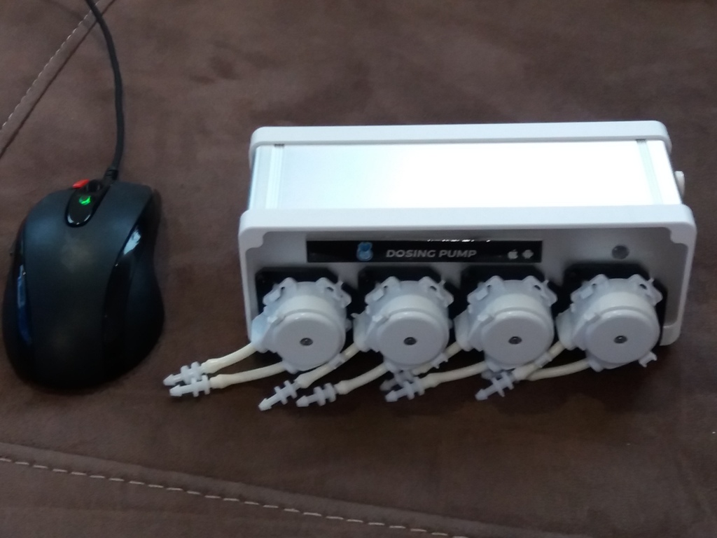 Заказал на Fish-Street.com дозатор Coral Box WF-04 WIFI Dosing Pump. Стоимость 179$. Это новая улучшенная версия Jebao DP4, главные отличия это более надежные помпы, точность дозирования, маленькии размер и конечно же управление через телефон по вайфаю. Доставка из Гон Конга 3 недели на обычную укрпочту, доставка обошлась в 2$, шара. Первые впечатления - дозирует после калибровки точно, глюков нет, управлять, менять дозу через телефон классно, и это все что мне от него надо. На фотках его размер по сравнению с мышкой.