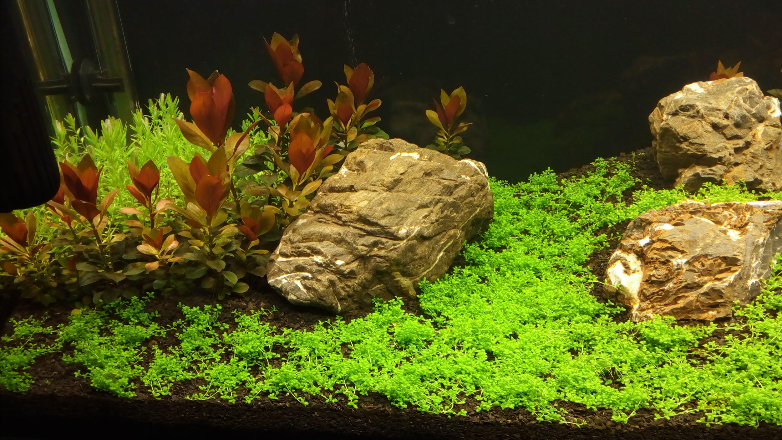 Было у меня хобби в детстве, аквариумные рыбки.. самодельные фильтры навесные, обогреватели, на сколько помню u образная колба, две пробки, два стержня (не помню от чего их тогда мы брали), вода и соль как регулятор мощности.. меня до сих пор родные троллят, как я с рыбок уху сварил (наверное много соли всыпал  ). Это было больше 10 лет назад.. Ностальгия постоянно была за аквариумом, лет 5 назад планировал снова запустить аквариум, с того "запуска" удобрения остались  .. но чет не дошло до этого.. Вообщем смотрел я в три часа ночи блогера аквариумиста.. и в тоже время, ночью достал аквариум с кладовки, поставил его (пустым) и решил снова заняться этим делом.. Аквариум старенький, пошарпаный на 50 литров, крышки не было, посчитал, чтобы сделать крышку, нужно потратится не много.. вообщем решил купить все новое. Купил аквариум на 112л, фильтр, светильник, тумбу от "природы" и остальное.. Было в плане создать типа травничек, то есть сделать акцент на растениях, хотел практически на все дно полянку с хемиантус кубы. Вчера пришли растения и я его запустил. Пока писал эту тему, зашла сестра и спросила не сварю ли я их снова  . Грунт базальт, на глаз 2-3 мм (у меня он остался с прошлого "запуска") и подложка под грунт Aquayer. Залил на дно воды, посадил растения и вот, что у меня получилось на фото внизу. Я заказывал хемиантус куба, rotala rotundifolia и rotala repens Rubin. Пришли растения, я представлял, что людвигия по другому будет выглядеть, длиные узкие листочки, а мне пришло маленькое растение с круглыми листочками (см фото внизу).. ломал голову, что же мне прислали такое неизвестное для меня.. как оказалось, что надводная форма отличается и в воде они вытянутся. Хочу с людвигии вырастить большой куст на весь угол аквариума.