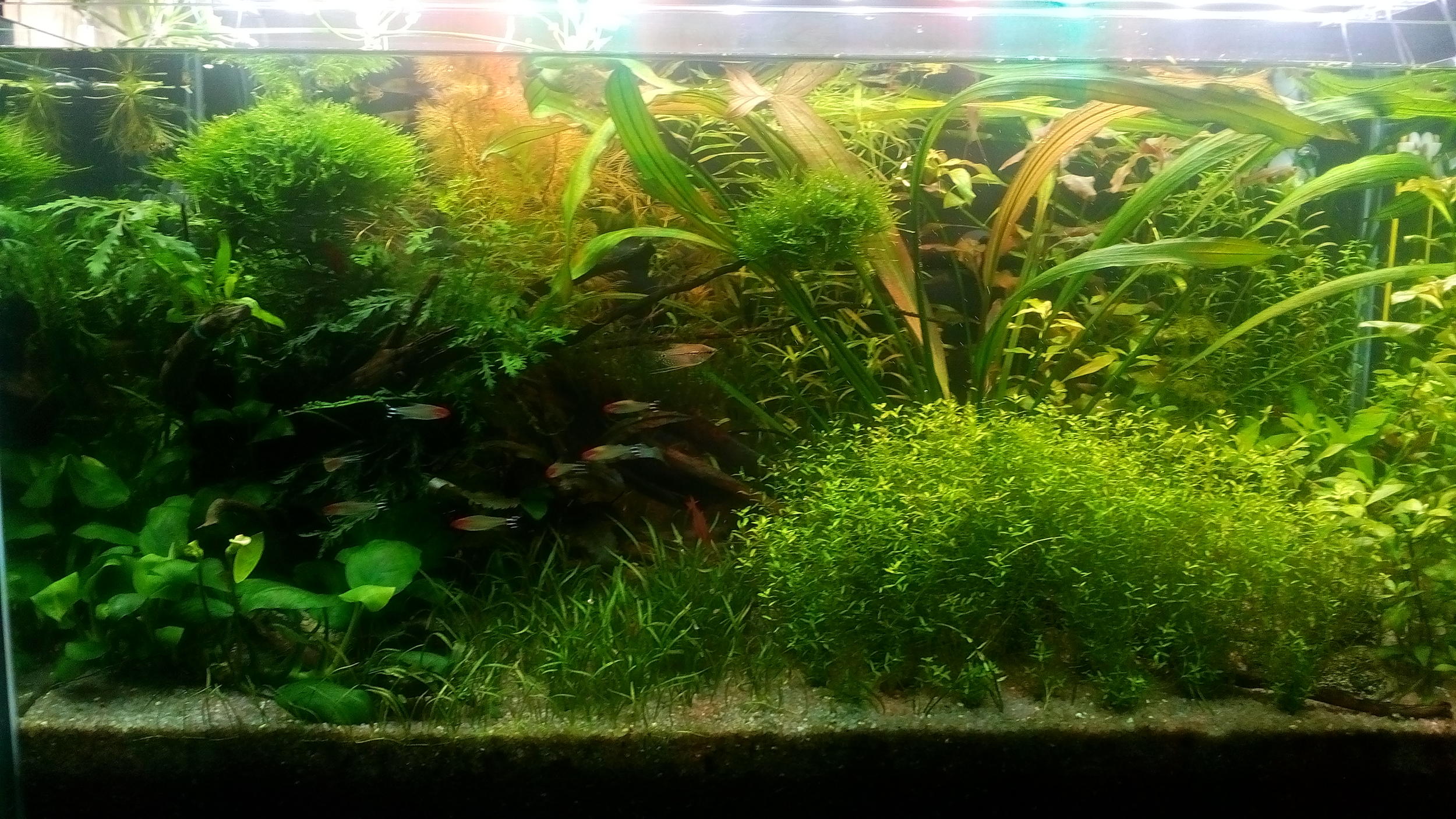 Флора: Rotala indica,Hottonia inflata,Pogostemon erectus,Hemianthus callitrichoides "Cuba" , Eleocharis pusili,Cryptocoryne parva,Cryptocoryne nurii «Rosen Maiden» Bt.Perah,Cryptocoryne lucens,Cryptocoryne wendtii mini,Аnubias barteri var. nana "Petite",Anubias nana 'Golden',Bucephalandra sp. Kedagang,Busephalandra sp."Kualakuayan-1,Hygrophila pinnatifida,Ludwigia arcuata,мхи (фисиденс,рикардия,мох ява), gratiola, bucefalanra D2, T4, ludvigia super red.