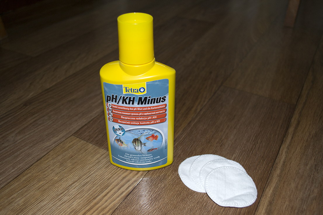 При этом сильно испаряется вода, оставляя на стеклах известковый налет. От которых я решил избавиться с помощью препарата PH/KH Minus и ватных дисков.