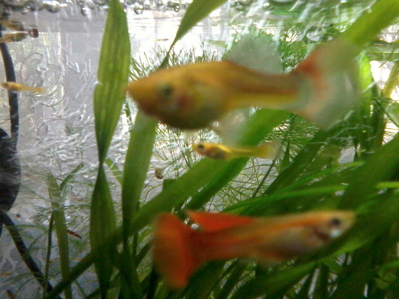 Но стоит учесть, что если хищник будет обитать в столь ограниченной емкости с жертвами, он очень быстро их уничтожит в отсутствии надежных укрытий. При весе моллинезии в 2 гр а гуппи в 1 гр, количество этих рыбок будет 30 моллинезий или 60 гуппи. Одна хищная цихлида весом в 12 грамм уничтожит их за пару недель или за месяц. Точно так же 700 беспозвоночных 4 огенных барбусов съедять за месяц. Поэтому будем подразумевать, что хищник может питаться только мальками живородок и молодью ракообразных. Это может быть гурами, один огненный барбус, рыбка петушок. Стоит отметить что лишних мальков живородки сами будут поедать (это явление называется адельфофагия), в условиях ограниченности ресурсов. Так же эти же живородки будут выедать избыток молодых ракообразных. Поэтому в систему лучше ввести пару анцитрусов весом по 5 грамм, они будут чистить стекло и дно от обрастаний и так же охотиться на лишних мальков и ракообразных. Хотя анцитрусы - плохие охотники. Численность улиток будет лимитироваться абиогенным фактором, а именно доступностью свободного кальция для построения раковины.