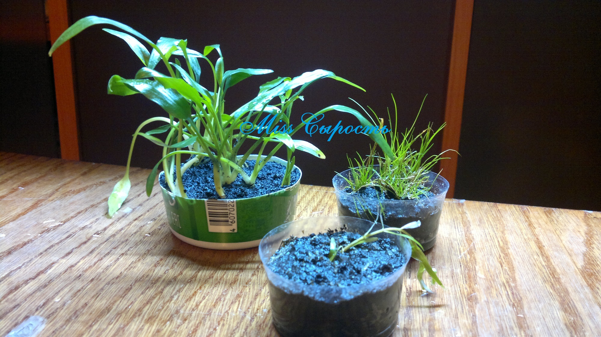 Затем на дне стаканчиков прорезаем отверстия 4мм. Берём синтетическую толстую нитку (фитиль) и просовываем в отверстие. Внутри стакана скручиваем фитиль кольцом. Затем насыпаем слой почвы из обычного рецепта, который я указывала в оглавлении темы. И пинцетом сажаем выбранное вами растение. Если корни слишком большие и мощные я обрываю их частично и оставляю длину корней 4-5 см. После посадки растений горшочки нужно поставить в тепличку с высокой влажностью. Тепличку желательно 1 раз в сутки проветривать приблизительно 1 минуту. На дно теплицы подливаем воду, можно с каплей удобрения. Как только корни хорошо оплетут весь ком почвы - вабикуса готова к оформлению вашего аквариума.