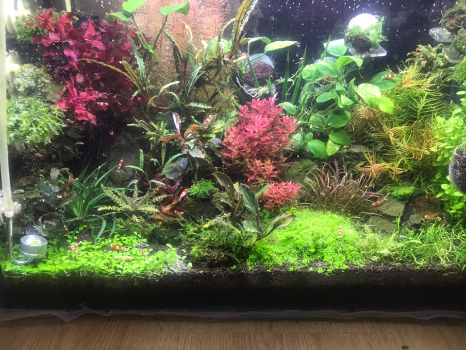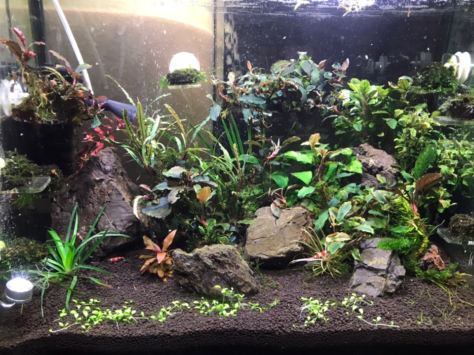 Планируется почвопокровка (глоса), мхи и буцефаладры. Также креветки кристаллы. Балонная СО2 присутствует.