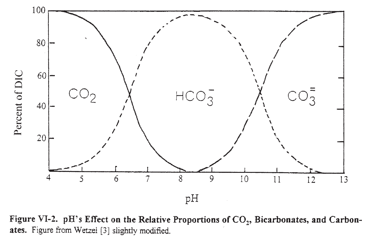 Не только СО2 влияет на рН, но и рН влияет на СО2 концентрацию. Так рН определяет пропорциональное соотношение в воде СО2, бикарбоната (НСО3-) и карбоната (СО3 (- -)). При рН от 5 и ниже, большая часть неорганического растворенного в воде углерода пребывает в состоянии СО2. При рН 6.5 – вода содержит приблизительно равное соотношение СО2 и бикарбоната. Когда вода достигает рн = 10, около 24% бикарбонатов переходят в карбонаты.