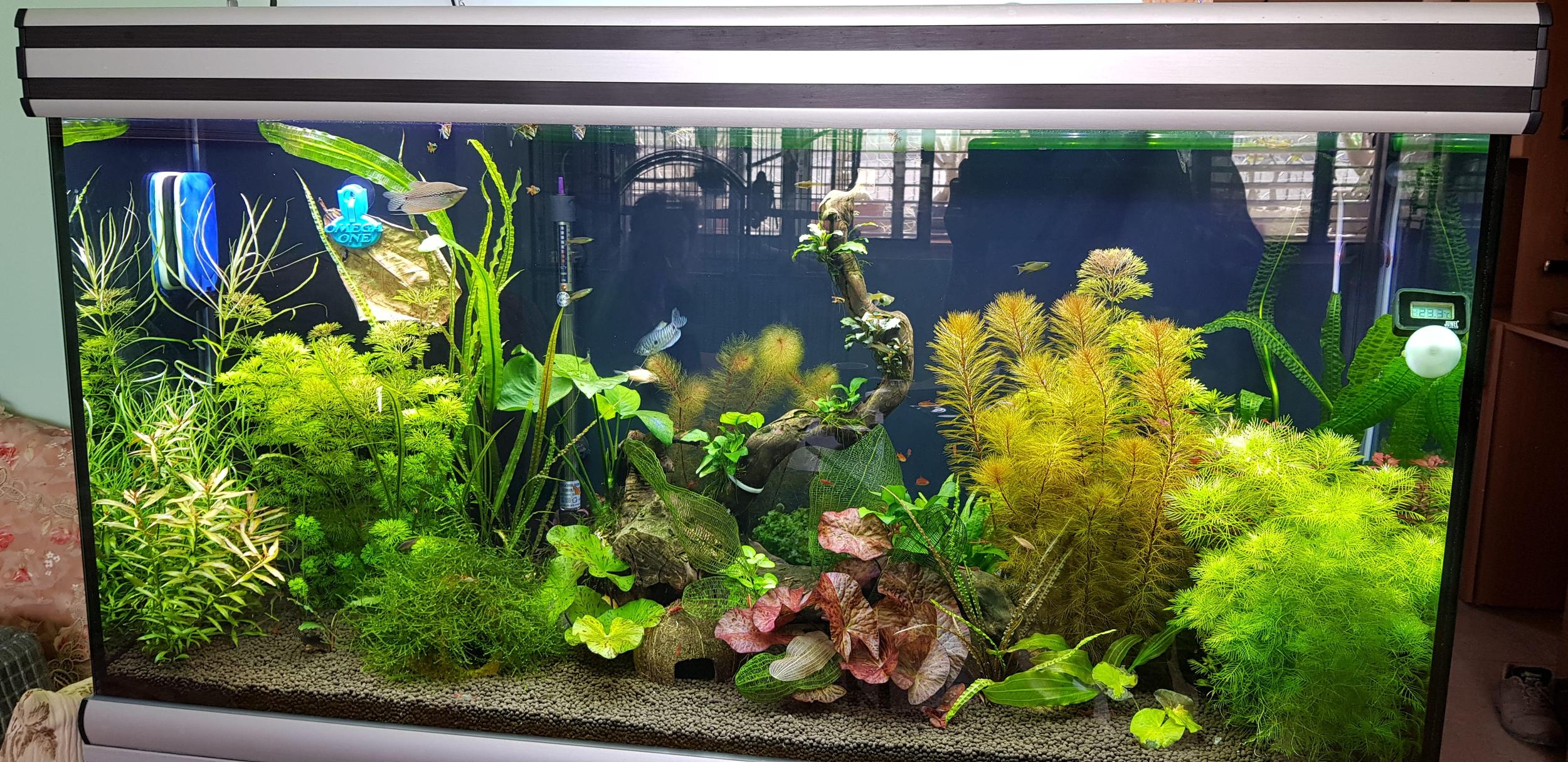Ну вот и я пожалуй напишу свой отзыв. Лампу получил 1 апреля, доволен-это ничего не сказать. Свет просто изумительный, рыбки и растения в аквариуме стали яркими и красивыми, работа сделана очень качественно. Рассветы, закаты, ночная подсветка, все очень красиво. Попросил сделать с запасом из 2-ух профилей, вышло на 18800 люменов, поэтому на полную мощность не включаю, слишком ярко получается. Растения растут прекрасно, тьфу-тьфу, более того со вчерашнего утра как начало все пузырять, причем аква у меня без со2, я просто в шоке. Приложу фотки сделанные в первый день с лампой 1.04 и вчера 12.04, правда я уже за это время пару раз обстригал некоторые растения, так что все должно было бы быть еще выше и еще некоторые растения с заднего плана убрал и посадил новые, но они еще маленькие и их не видно. Вообщем Игорю громаднейшее спасибо и мой совет заказывайте не прогадаете.