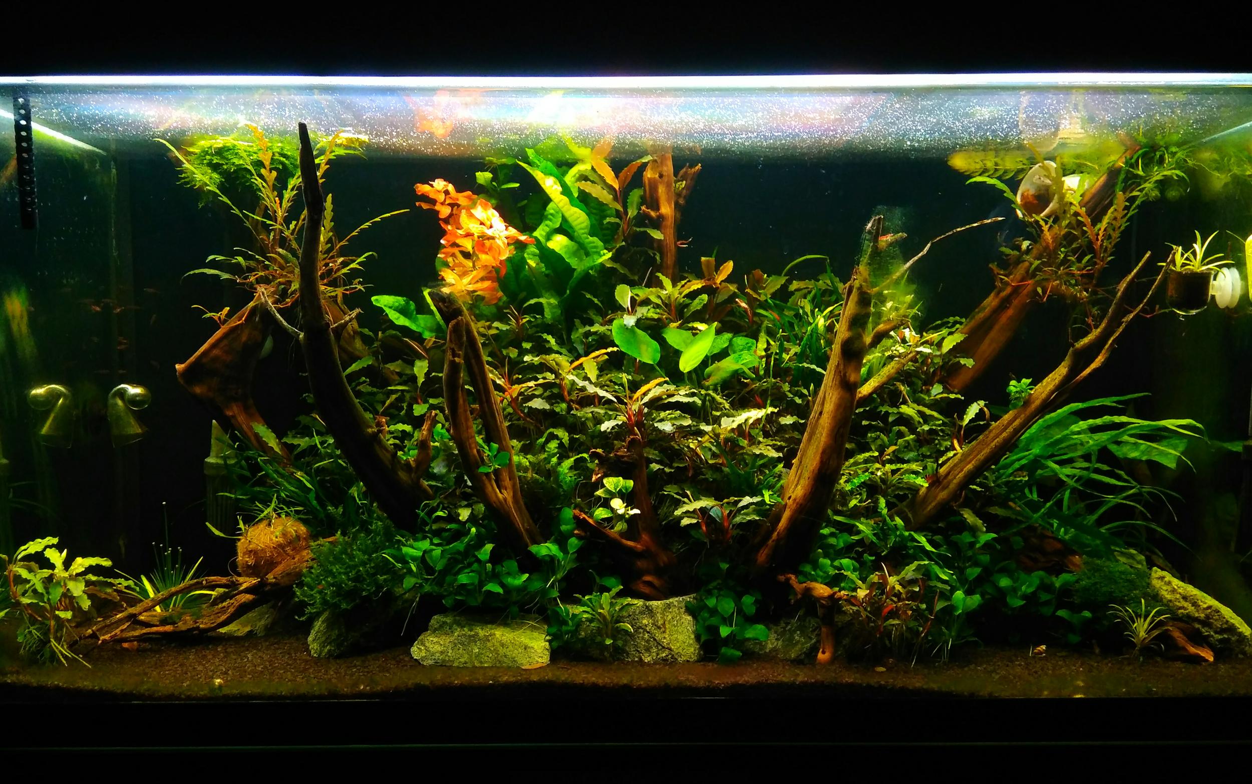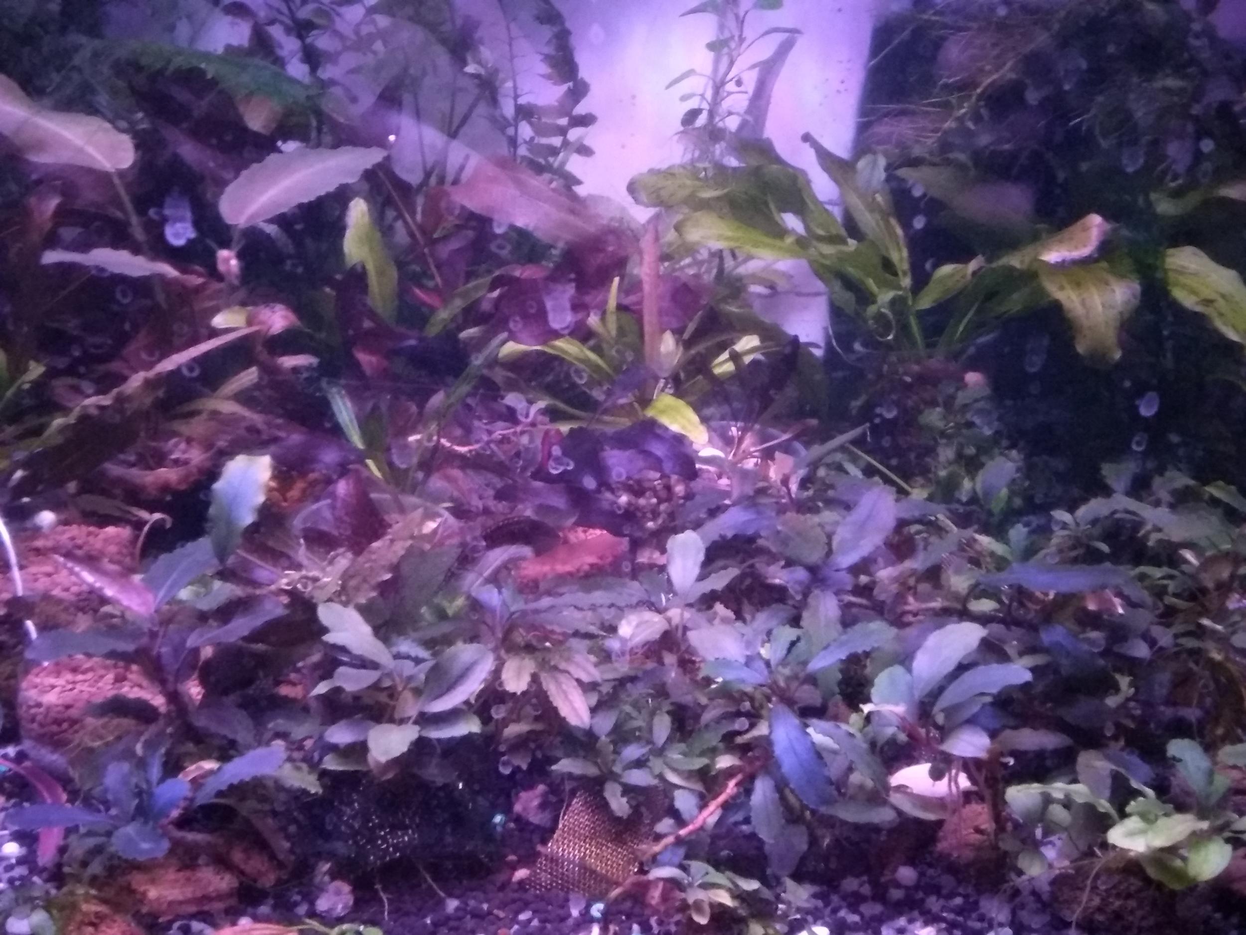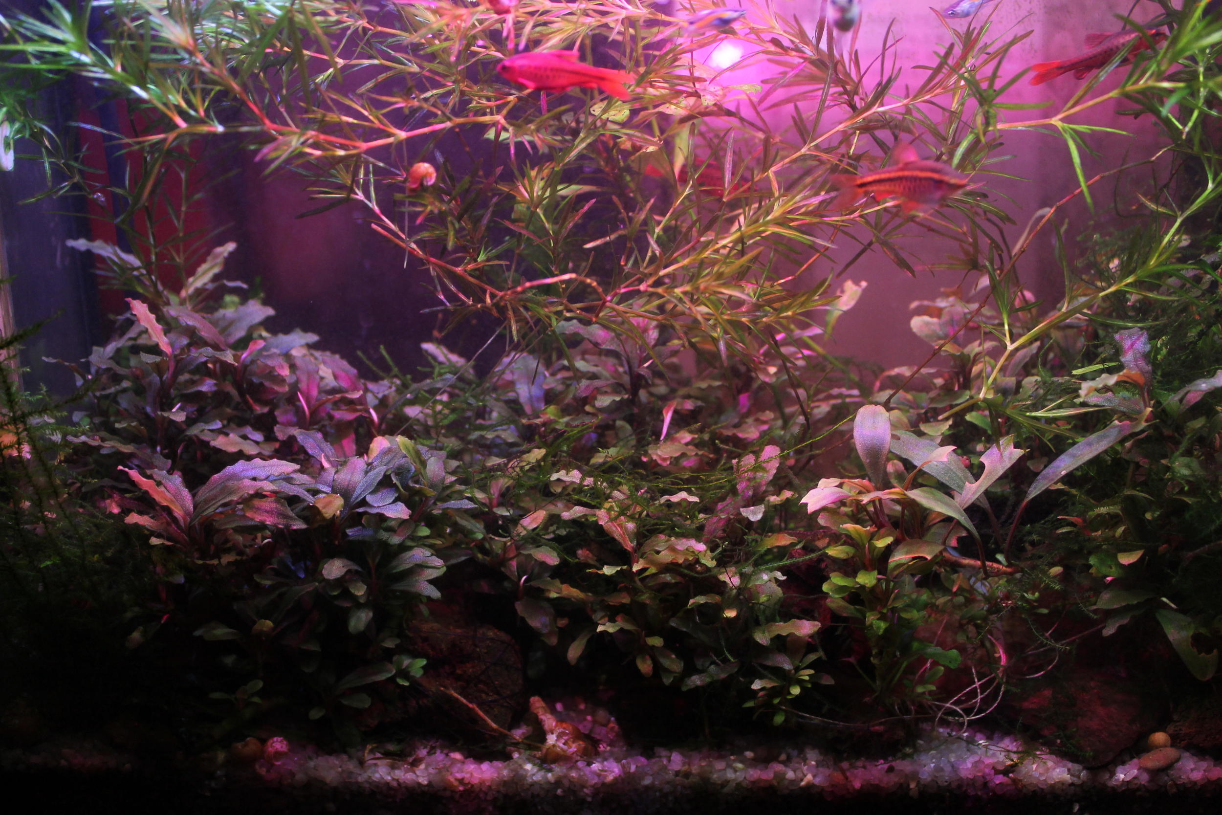 Как-то попали в мои руки кучка буцефаландр. Растения были потрепаны в борьбе с водорослями, в общак сажать их не стал, а приспособил под них 12 литровый аквариум в тумбе под основным. Грунт - кварц 2-3мм, свет - 1Вт дешевые светодиоды (7 шт, 6000К, 8000К, full), свечу с дневной паузой, грелка 10Вт (акваэлевская, стеклянная, без терморегулятора, жаль, уже не выпускают). Население - 6 вишневых барбусов, десяток неокаридин и сегодня запустил пяток эндлеров. Вода, - мешаю с осмосом. Подмениваю не регулярно, 1.5 литра примерно раз в месяц. Водорослей не наблюдаю. Стекла чищу раз в пару месяцев.Условия спартанские, но растения постепенно принялись и пошли в рост. Дизайном не пахнет, чисто техническая баночка.