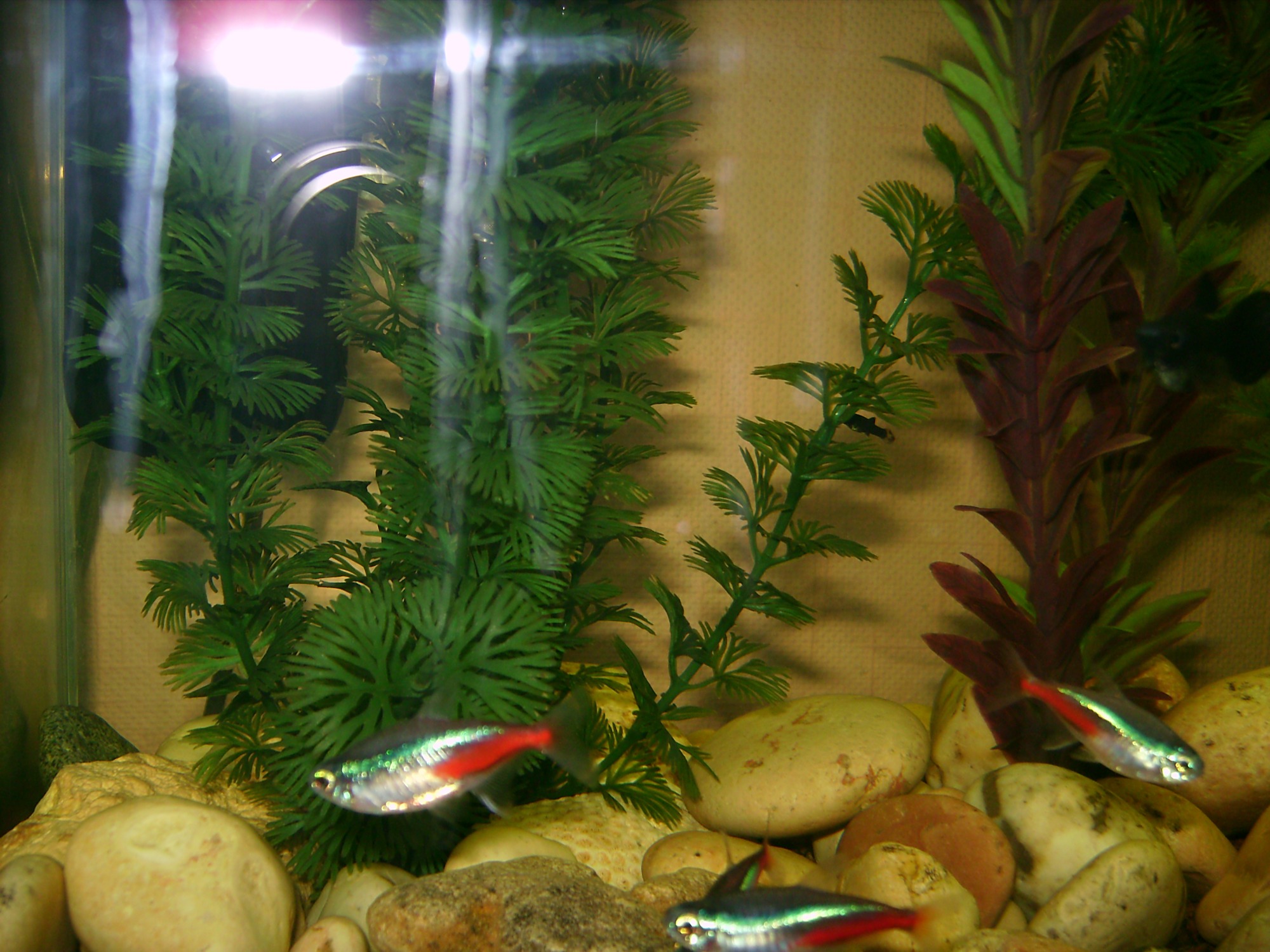 У меня аквариум 70 л.(может чуть больше). Стоит фильтр Акваэль фан 2 плюс (фильтру около 1,5 лет, работает стабильно). Рыбы - моллинезии, 15, неоны - 12, по 4 данио и меченосцев. Растения искуственные. А, еще 4 улитки. температура 25 градусов.